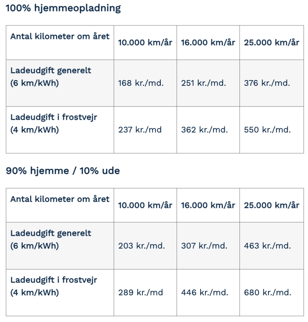 Ser man på regnestykket for hele året, vil du det meste af året kunne nøjes med en gennemsnitlig ladeudgift på 251 kr. om måneden og 362 kr. i vintermånederne, hvis dit årlige kørselsforbrug er 16.000 kilometer.