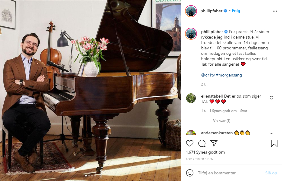 “For præcis ét år siden rykkede jeg ind i denne stue. Vi troede, det skulle vare 14 dage, men blev til 100 programmer, fællessang om fredagen og et fast fælles holdepunkt i en usikker og svær tid. Tak for alle sangene,” lyder det i opslaget.
