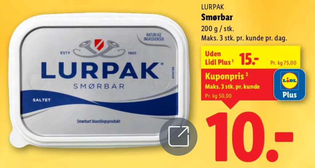 I den seneste tilbudsavis fra Lidl kan kunder købe Lurpak smørbar på 200 gram til blot 10 kroner.
