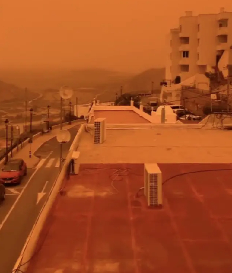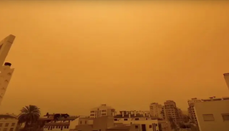 Det skyldes ifølge vejreksperter, at sand fra Saharaørkenen er blæst ind over de sydeuropæiske lande samtidig med, at stormen Celia har bragt stærke vindstød og store mængder regn med sig.