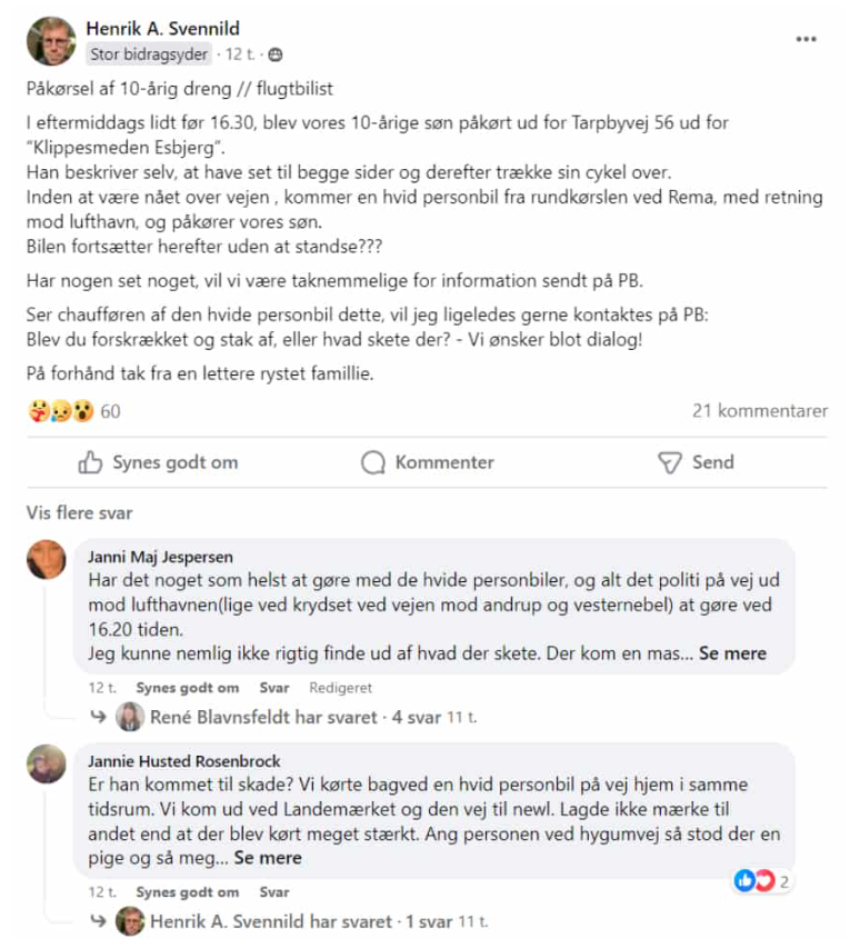 “Ser chaufføren af den hvide personbil dette, vil jeg ligeledes gerne kontaktes på PB. Blev du forskrækket og stak af, eller hvad skete der? Vi ønsker blot dialog. På forhånd tak fra en lettere rystet familie,” lyder det i opslaget, som han har delt i en lokal Facebookgruppe, der dækker Tarp, Bryndum og Vester Nebel.