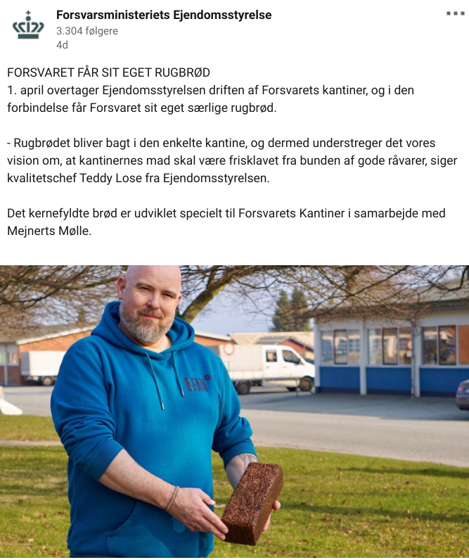 “Det kernefyldte brød er udviklet specielt til Forsvarets Kantiner i samarbejde med Mejnerts Mølle,” har styrelsen forklaret.