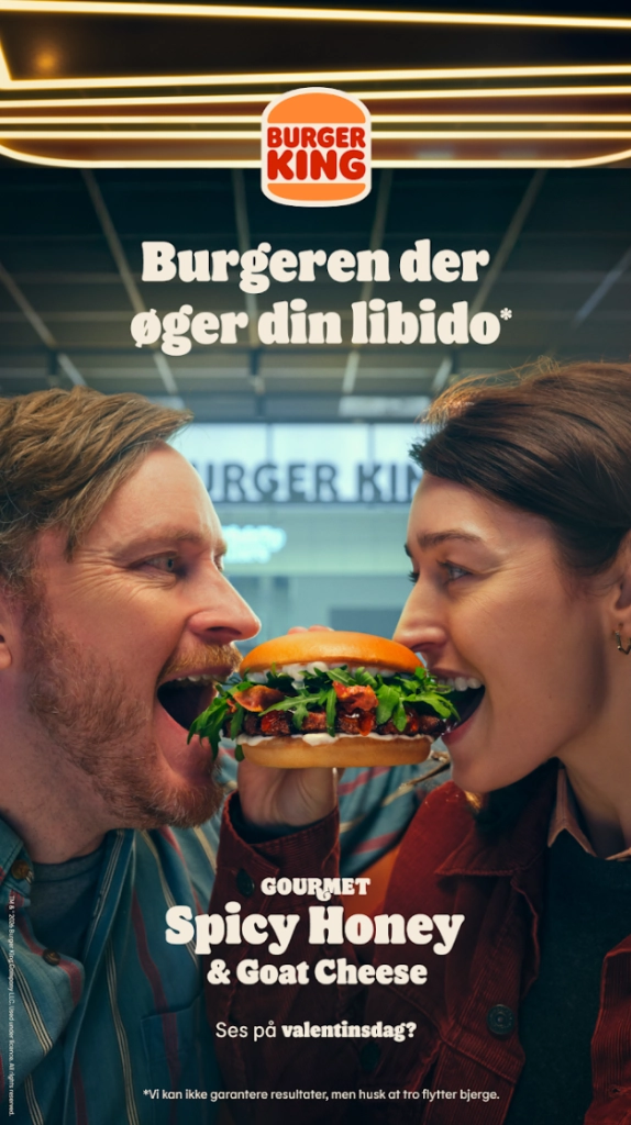 I forbindelse med Valentinsdag lancerer Burger King burgeren Gourmet Spicy Honey & Goat Cheese, en helt ny burger, der med helt særlige ingredienser skal få danskernes sexlyst til at stige.