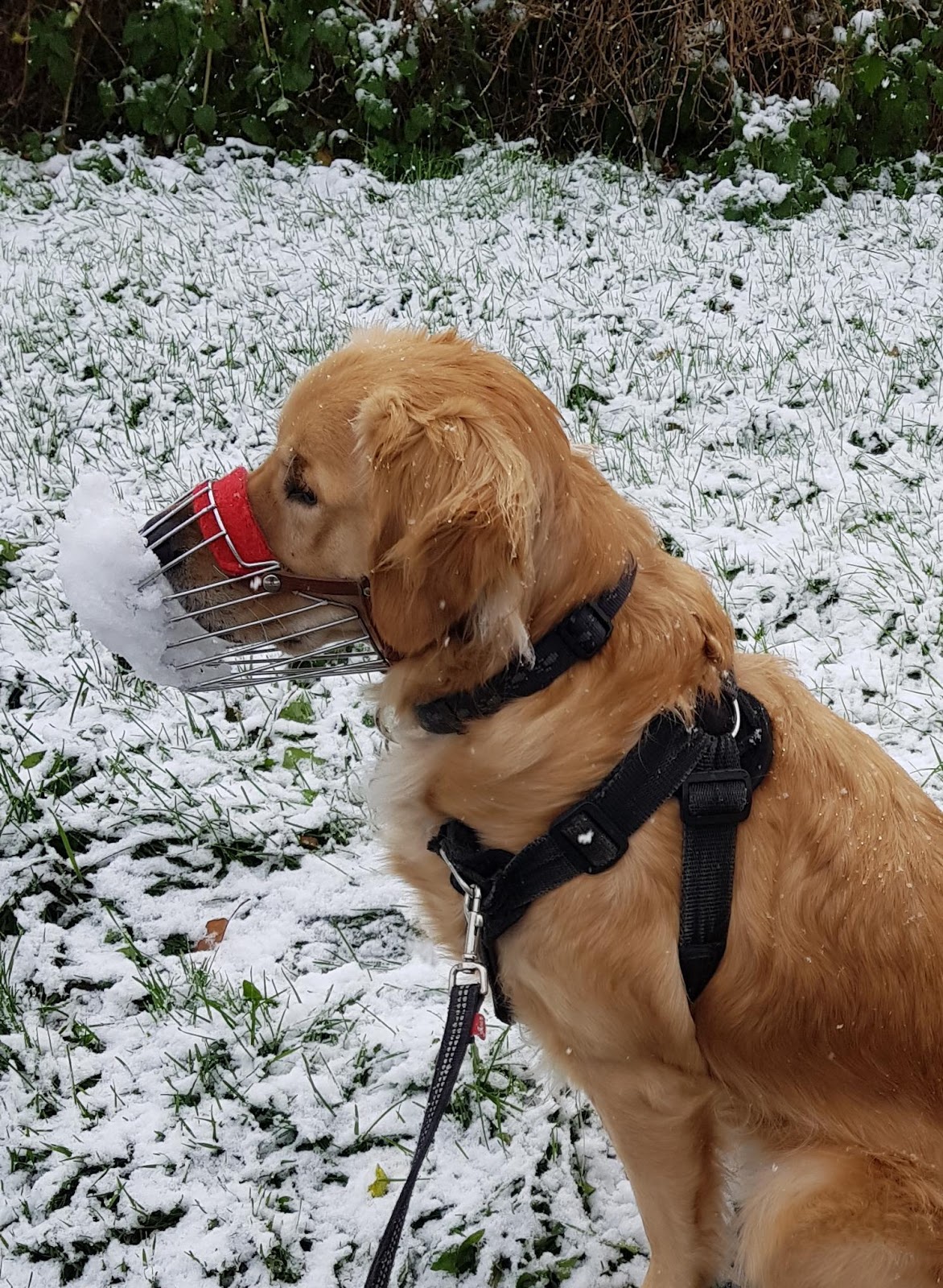 For at Lego skal overleve, har han nu mundkurv på, når han er udenfor. Først prøvede de en af stof, men han spiste alt muligt alligevel, så nu er den af metal. Lego har vænnet sig til den og stikker hovedet frem, når de skal ud og gå tur. Som det ses på billedet herunder, har han fundet ud af, at den kan bruges som plov, når der er sne.
