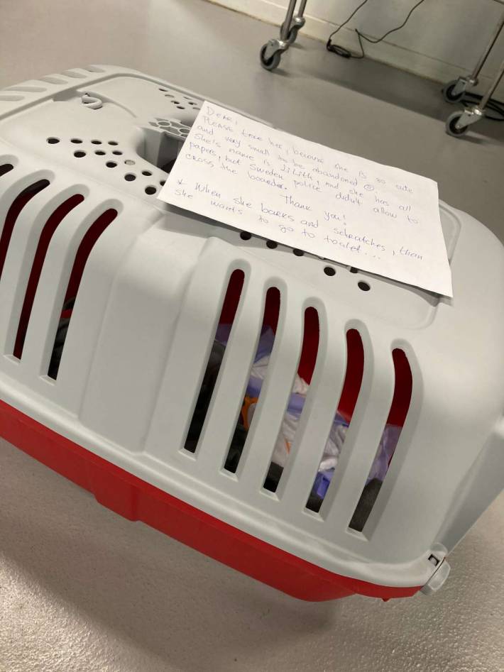 Den fluffy lille hundehvalp blev fundet på en tankstation på Helsingør. Udover hundehvalpen, var der også efterladt flere ting. Hundehvalpen befandt sig i en transportkasse, hvor der var en seddel til.