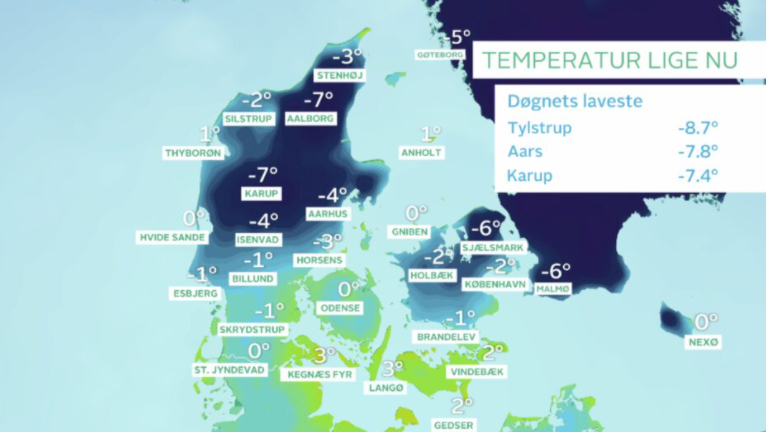 Der er således blevet målt minusgrader i stort set hele landet her til morgen, og i Tylstrup i Nordjylland blev der målt helt ned til -8,7 grader klokken seks i morges.