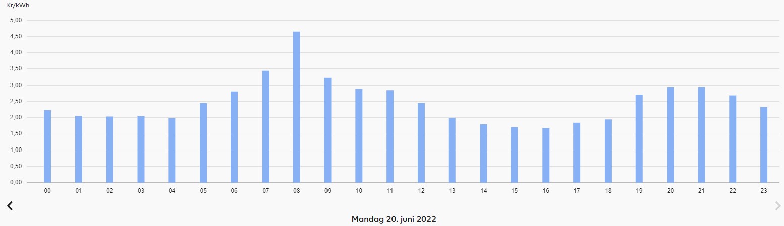 Fra 18 og frem til midnat vil prisen igen være mellem 2 og 3 kroner pr. kilowatt.