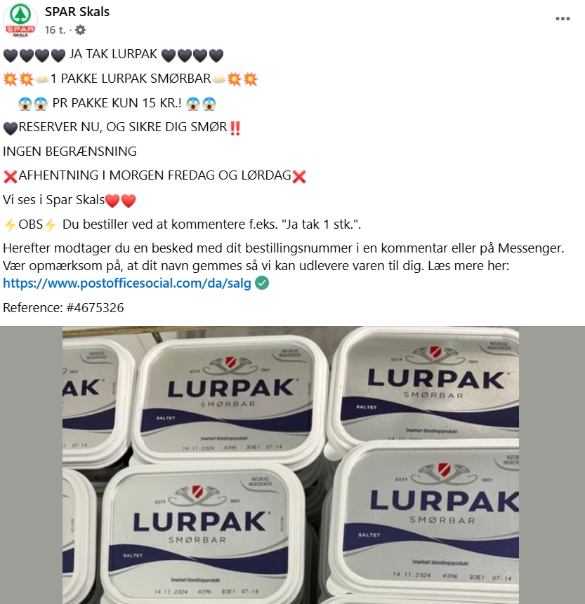 I Spar-butikken i den midtjyske by Skals sælges Lurpak smørbar i øjeblikket til en pris, der ligger markant under det vanlige.