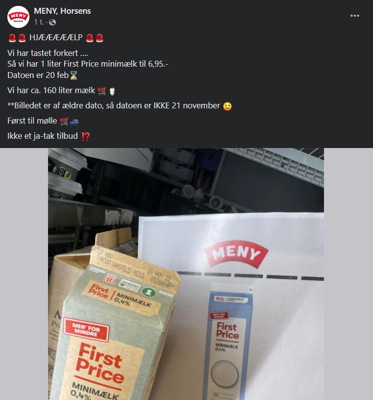 Sammen med opslaget har de delt et billede af minimælk fra First Price som er den mælk, der er på tilbud. Det fremgår dog på billedet af mælken har sidste holdbarhedsdato den 21. november 2022, hvilket er måneder siden.