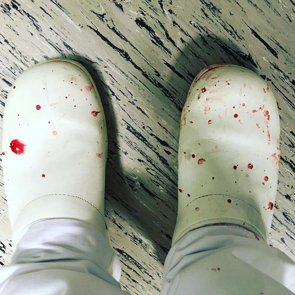 – Parkerer skoene efter weekendens vagter. En nattevagt og en dagvagt, hvor jeg sammen med gode kolleger har opereret sløje patienter, syet spritstive festabers huller i hovedet, modtaget traumer med mere, skriver Michael Larsen.