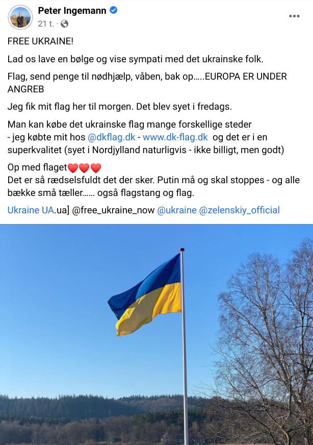 Selv har han, kan man se på et billede, som er delt sammen med opslaget, valgt at købe et ukrainsk flag, som han har fejst i sin flagstang.