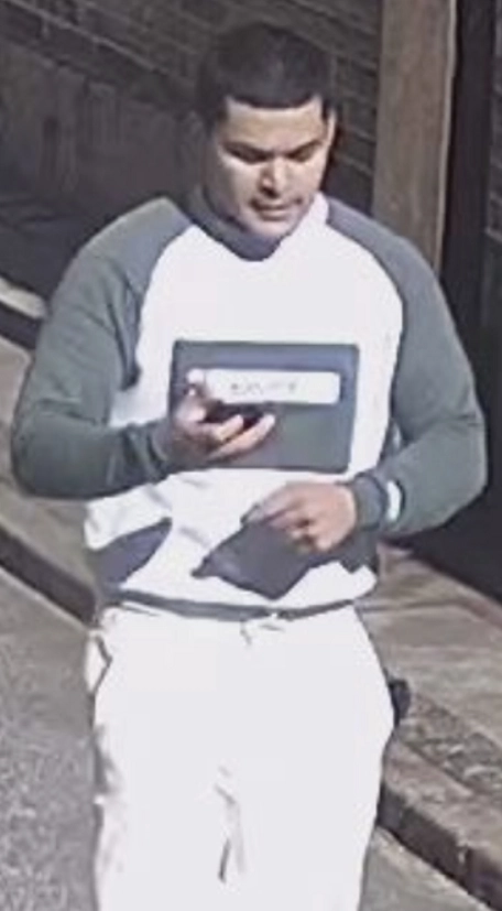 På gerningstidspunktet var han iført en grå hættetrøje med lynlås og skrift på, sort kasket med “NY”, sorte bukser og hvide sneakers.