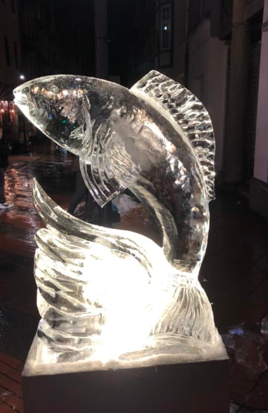 Isskulpturerne blev i løbet af fredagen lavet af otte forskellige kunstnere og flere af dem havde varer fra byens butikker inden i sig og var lyst op af spotlys.