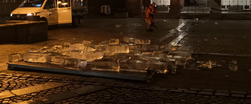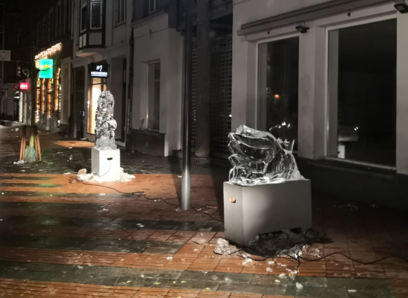 Lørdag morgen skulle have været en festdag i den jyske by Kolding, hvor byens mange tusinde borgere skulle have haft mulighed for at beundre otte isskulpturer, som var placeret forskellige steder langs byens centrale gågade i forbindelse med KOLDfestival.