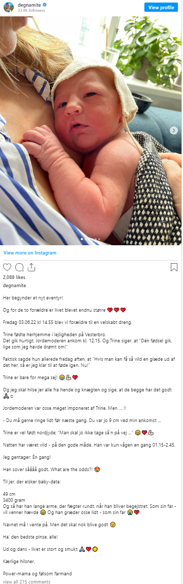 “Fredag 03.06.22 kl. 14.55 blev vi forældre til en velskabt dreng. Trine fødte herhjemme i lejligheden på Vesterbro. Det gik hurtigt. Jordemoderen ankom kl. 12.15. Og Trine siger, at den fødsel gik, lige som jeg havde drømt om!,” skriver han.