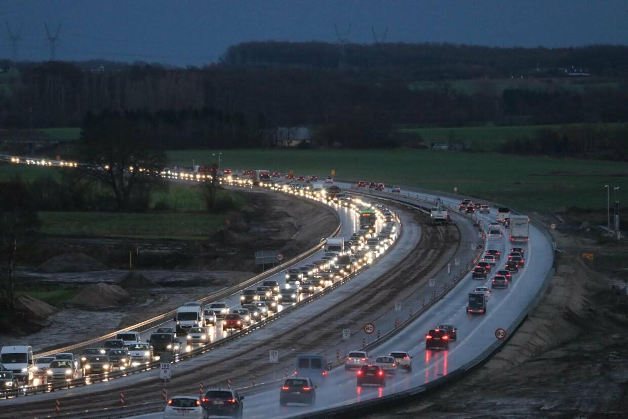 Vejdirektoratets trafikkort viser, at der er tale om meget tæt trafik med hastighederne nede under 25 km/t.