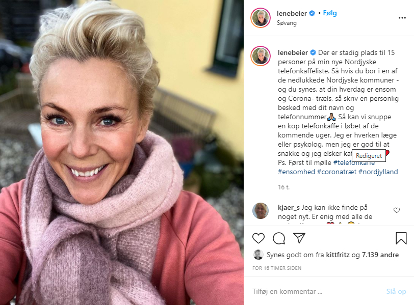 “Der er stadig plads til 15 personer på min nye Nordjyske telefonkaffeliste. Så hvis du bor i en af de nedlukkede Nordjyske kommuner – og du synes, at din hverdag er ensom og Corona- træls, så skriv en personlig besked med dit navn og telefonnummer;” skriver hun i sit seneste opslag.