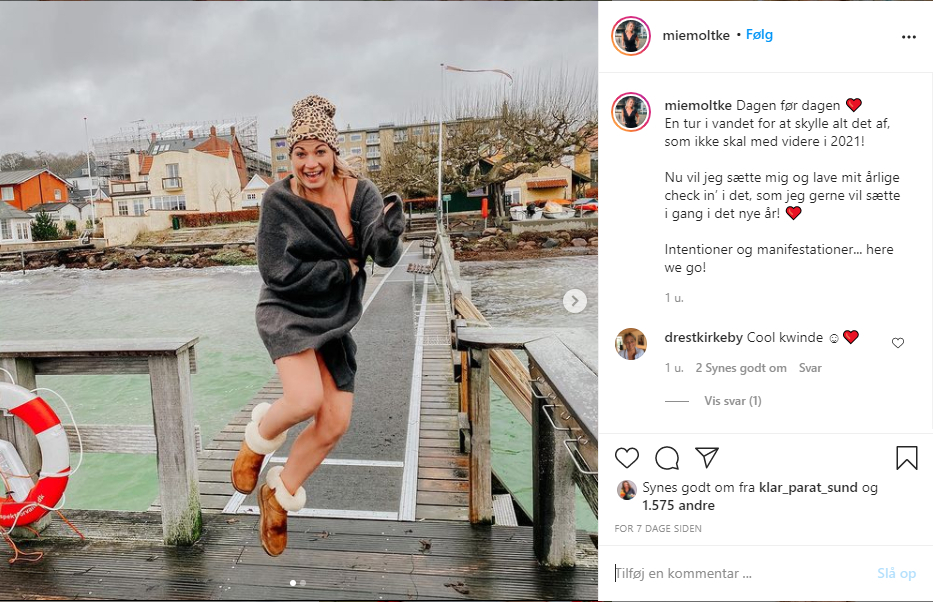 “En tur i vandet for at skylle alt det af, som ikke skal med videre i 2021,” skrev Mie Moltke i sit opslag