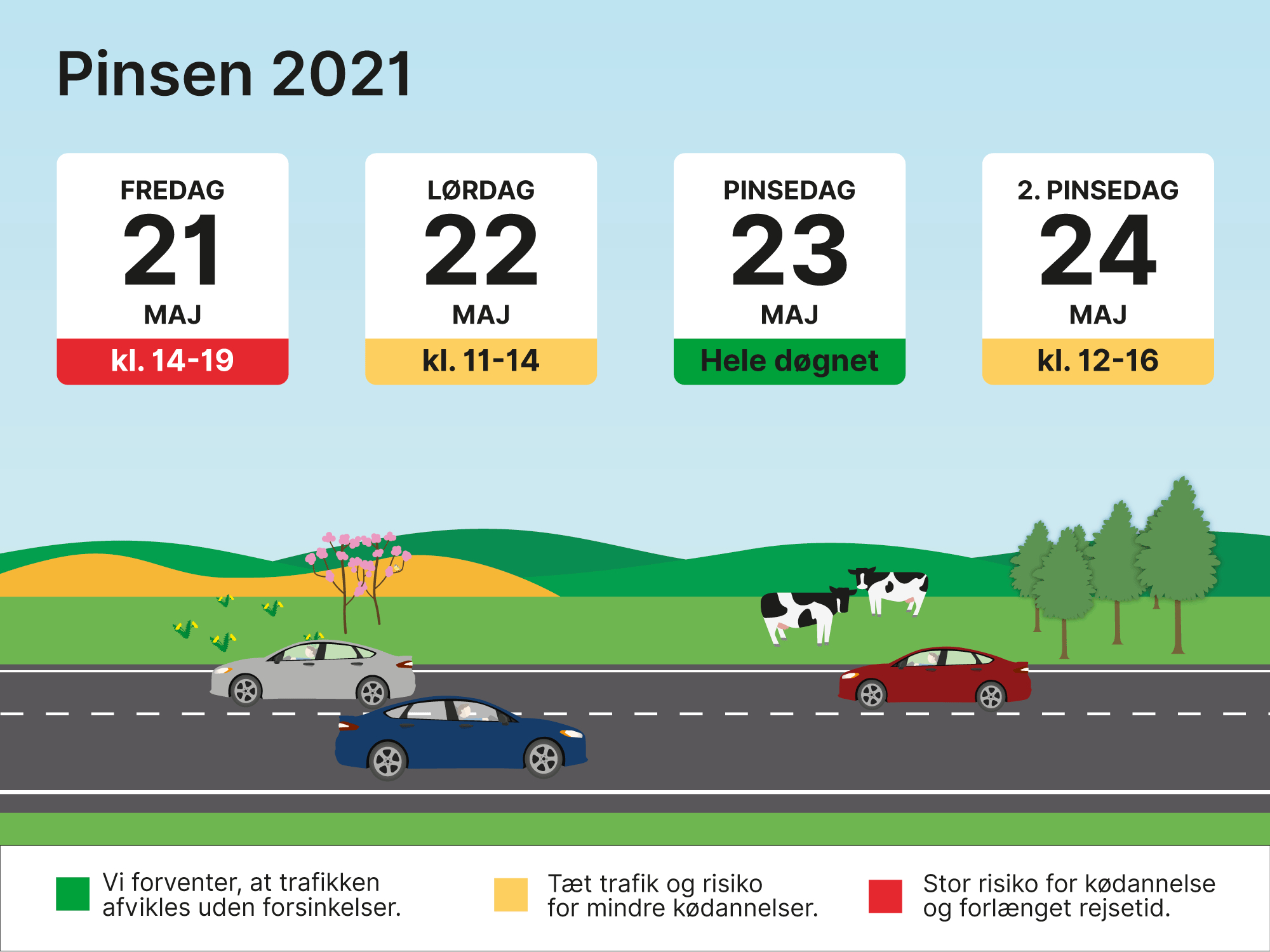 For mange danskere er Pinsen ensbetydende med sommerhustur og familiesammenkomster rundt om i landet. Derfor forventes det, at der kan opstå kødannelser på vejene på udvalgte dage i ferien.