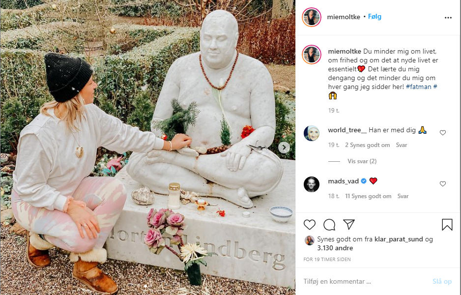 “Du minder mig om livet, om frihed og om det at nyde livet er essentielt. Det lærte du mig dengang og det minder du mig om hver gang jeg sidder her,” skriver hun til billedet, hvor hun sidder ved Morten Lindbergs gravsten, og det er bestemt ikke hvilken som helst gravsten. Det er nemlig et monument opført i hvidt marmor, der står på Assistens Kirkegården, hvor Morten Lindberg er begravet.