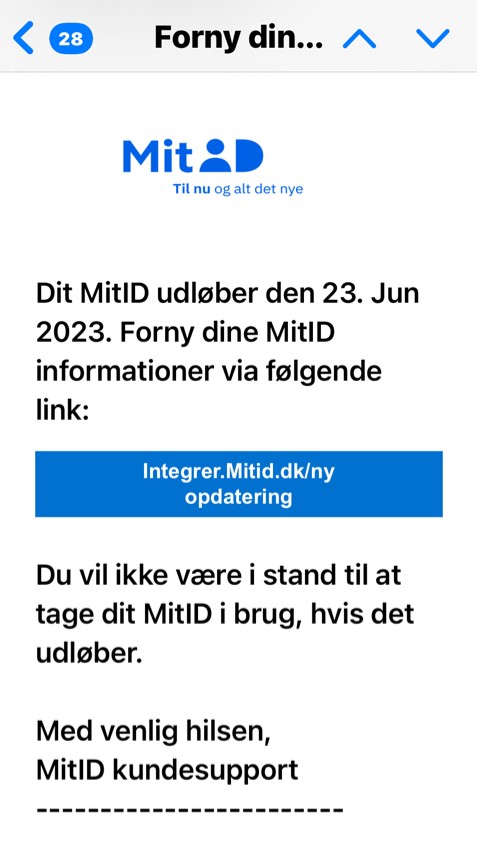 Der florerer i øjeblikket falske mails med MitID kundesupport som afsender om, at dit MitID udløber, og at du skal trykke på et link på at opdatere dine MitID-informationer. Mailen er falsk, og du skal ikke klikke på linket.