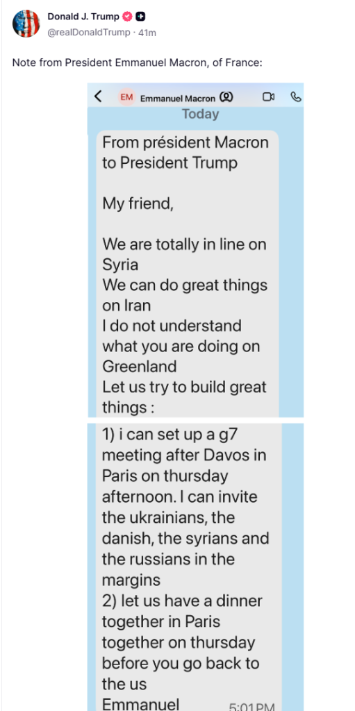 Ifølge Trump stammer beskeden fra Frankrigs præsident, Emmanuel Macron, og indeholder en direkte undren over Trumps håndtering af Grønland.