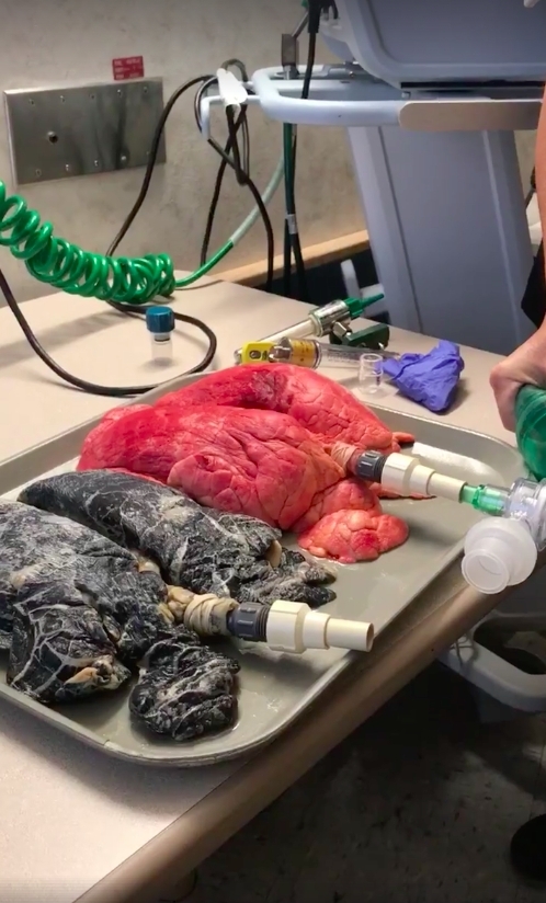 I videoen demonstrerer den amerikanske sygeplejerske fra staten North Carolina forskellen mellem kræftramte rygerlunger fra en afdød patient, der har røget en pakke cigaretter hver dag i 20 år og et par velfungerende friske lunger.