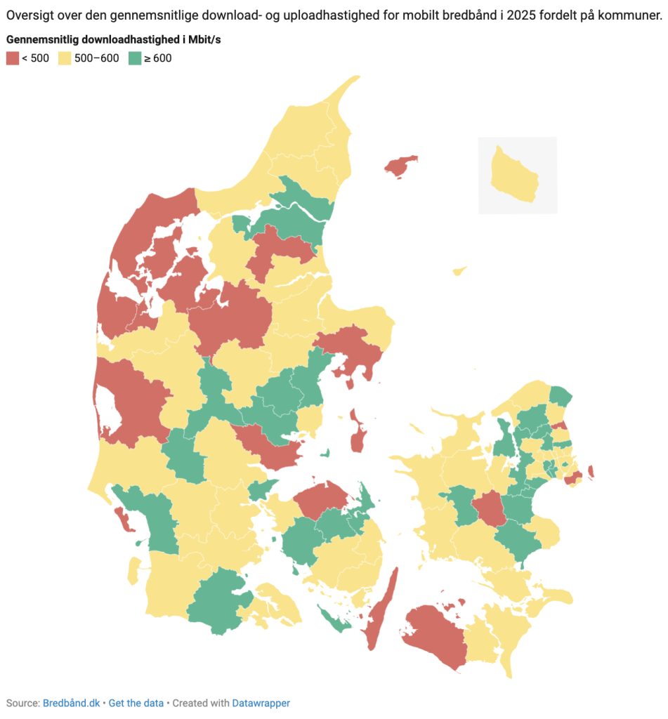 Omvendt er Samsø Kommune stedet med den værste dækning med en gennemsnitlig downloadhastighed på 270 Mbit/s.