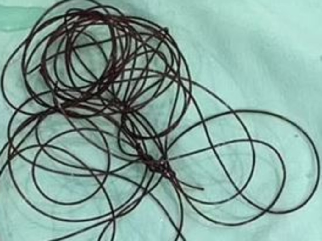 Lægerne var ikke i stand til at fjerne den lange snor ved hjælpe af en blæreskylning, som er en procedure, hvor væske skylles gennem et kateter og ind i blæren.