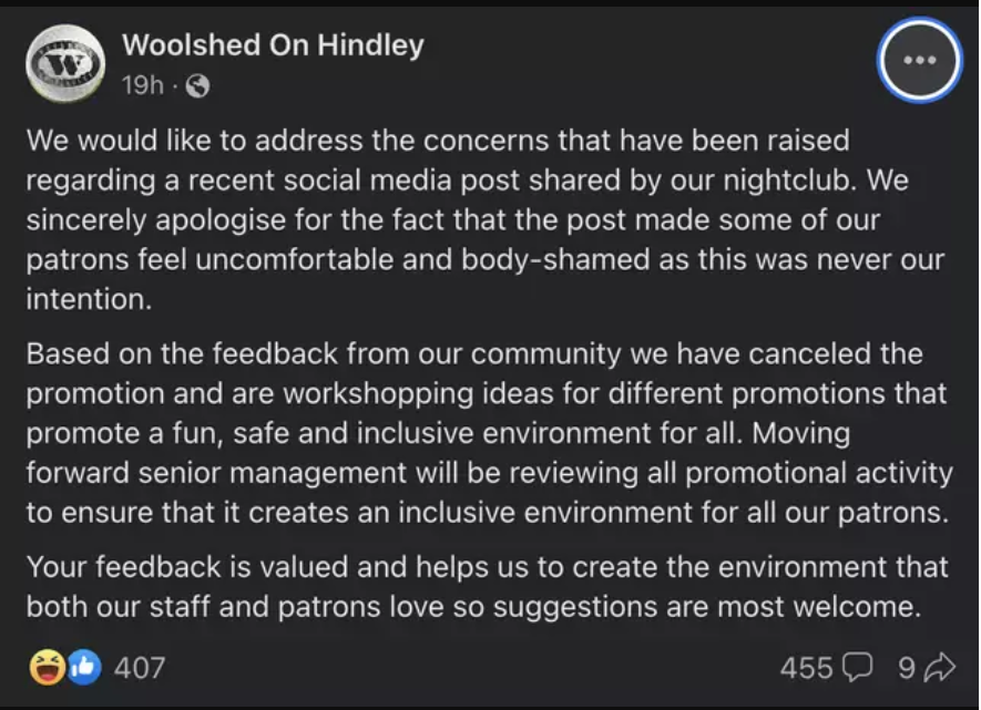 The Advertiser rapporterede, at The Woolshed på Hindley  i Adelaide – er blevet haglet ned online for sin seneste kampagne.