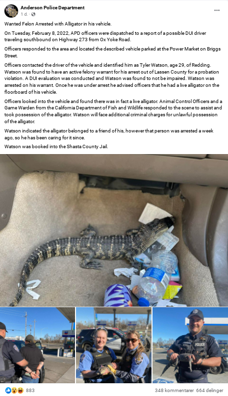 Sagen udviklede sig dog på flere måder til noget helt andet end en sag om spirituskørsel. Det har Anderson Police Department skrevet i et opslag på Facebook, som blev delt i går, d. 9. februar.