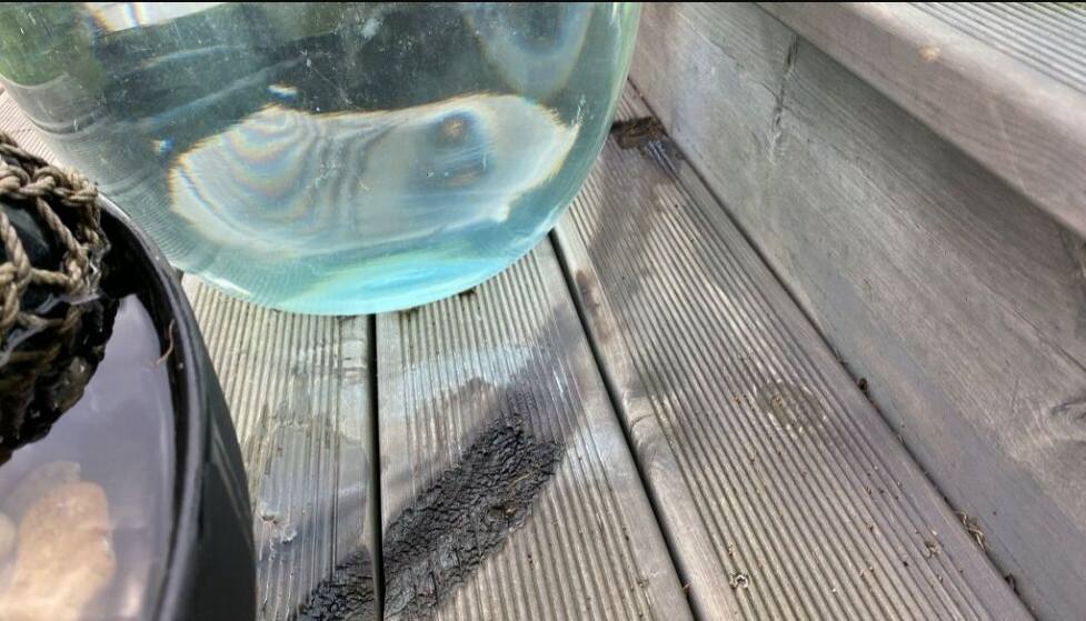 Britt fik sig noget af en overraskelse på hendes terrasse, da solens stråler ramte den.