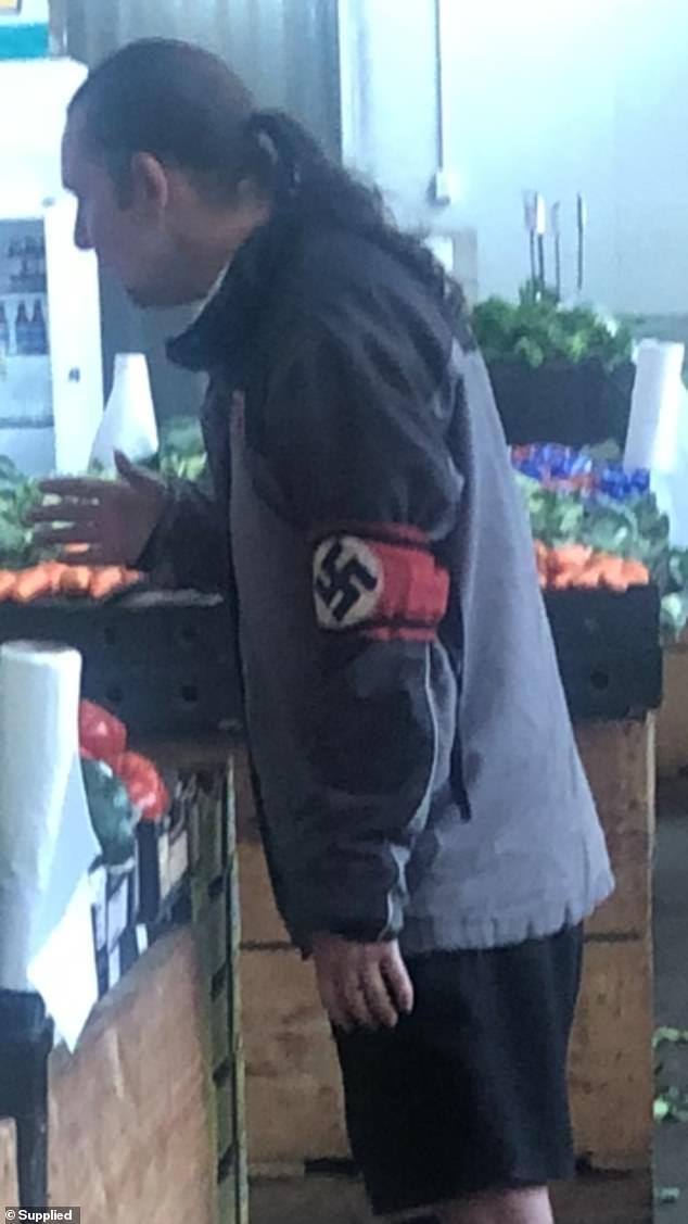 En mand chokerede flere handlende i et supermarked, mens han stod og udvalgte frugt. På hans ene overarm var han nemlig iført et bind med et hagekors.