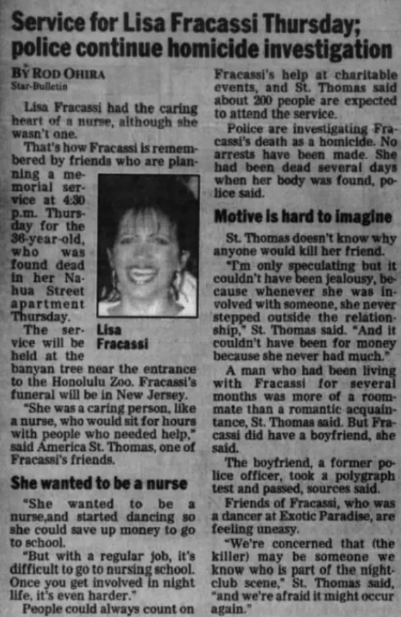 Den 3. november 1994 blev den 37-årige eksotiske danserinde Lisa Fracassi kvalt til døde med et telefonkabel i sin lejlighed på Nehua Street i Honolulu, Hawaii.