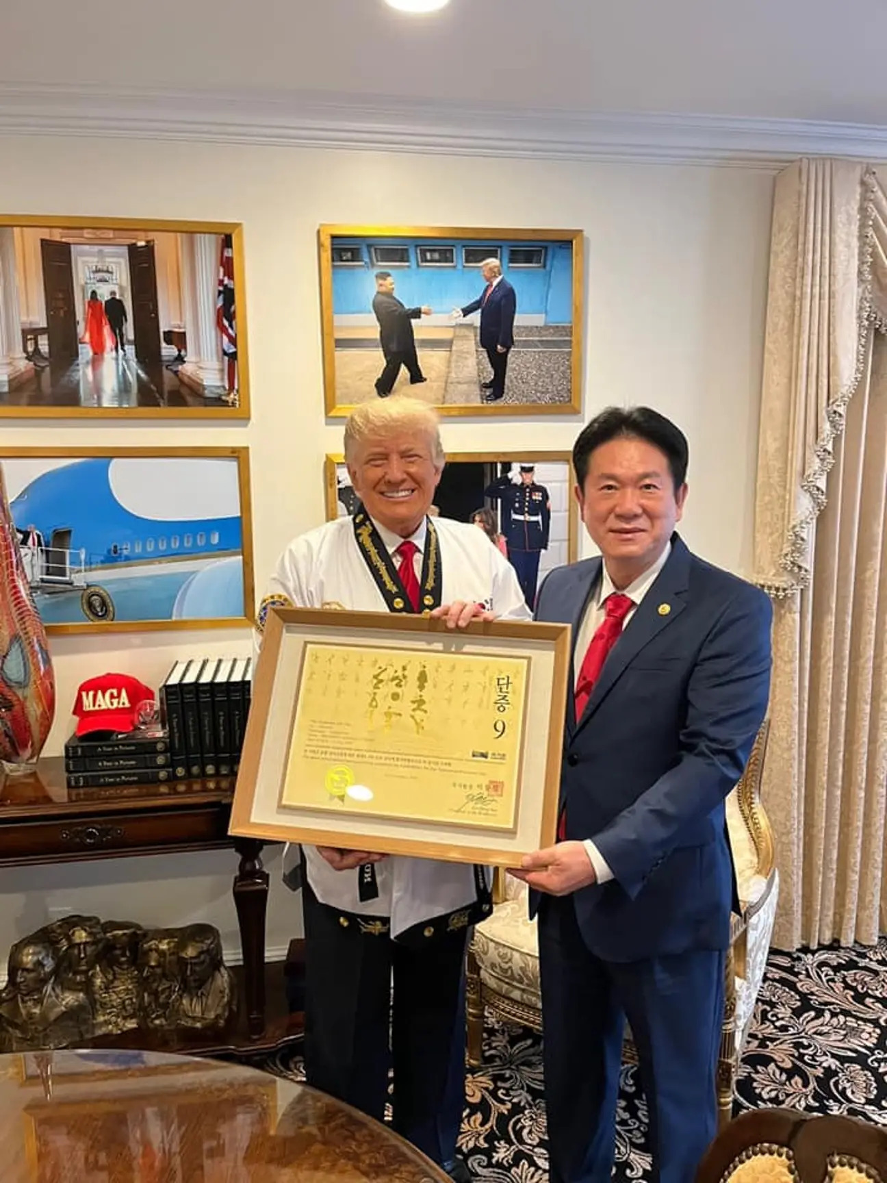 Den 75-årige Donald Trump blev præsenteret med et certifikat i Florida fredag den 19. november af Lee Dong-sup, der er formand for taekwondo-organisationen Kukkiwon.