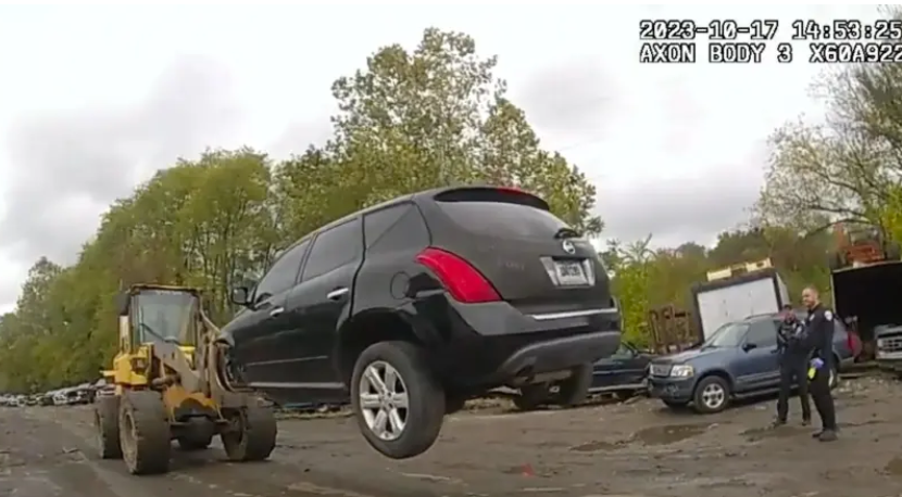 Den betjent, der optog optagelsen, gik derefter hen for at tale med medarbejdere hos Arlington Auto Wrecking, hvor hændelsen fandt sted. Manden, der hurtigt kørte gaffeltrucken for at holde den mistænkte, sagde: “Bilen begynder at hoppe og var ved at vælte ud af gaffeltrucken.”