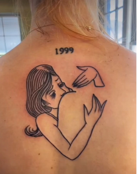 Hvis man tager et kig på den færdige tatoveringen, så ligner det, at kvinden har sine arme viklet omkring et andet menneskes bagdel.