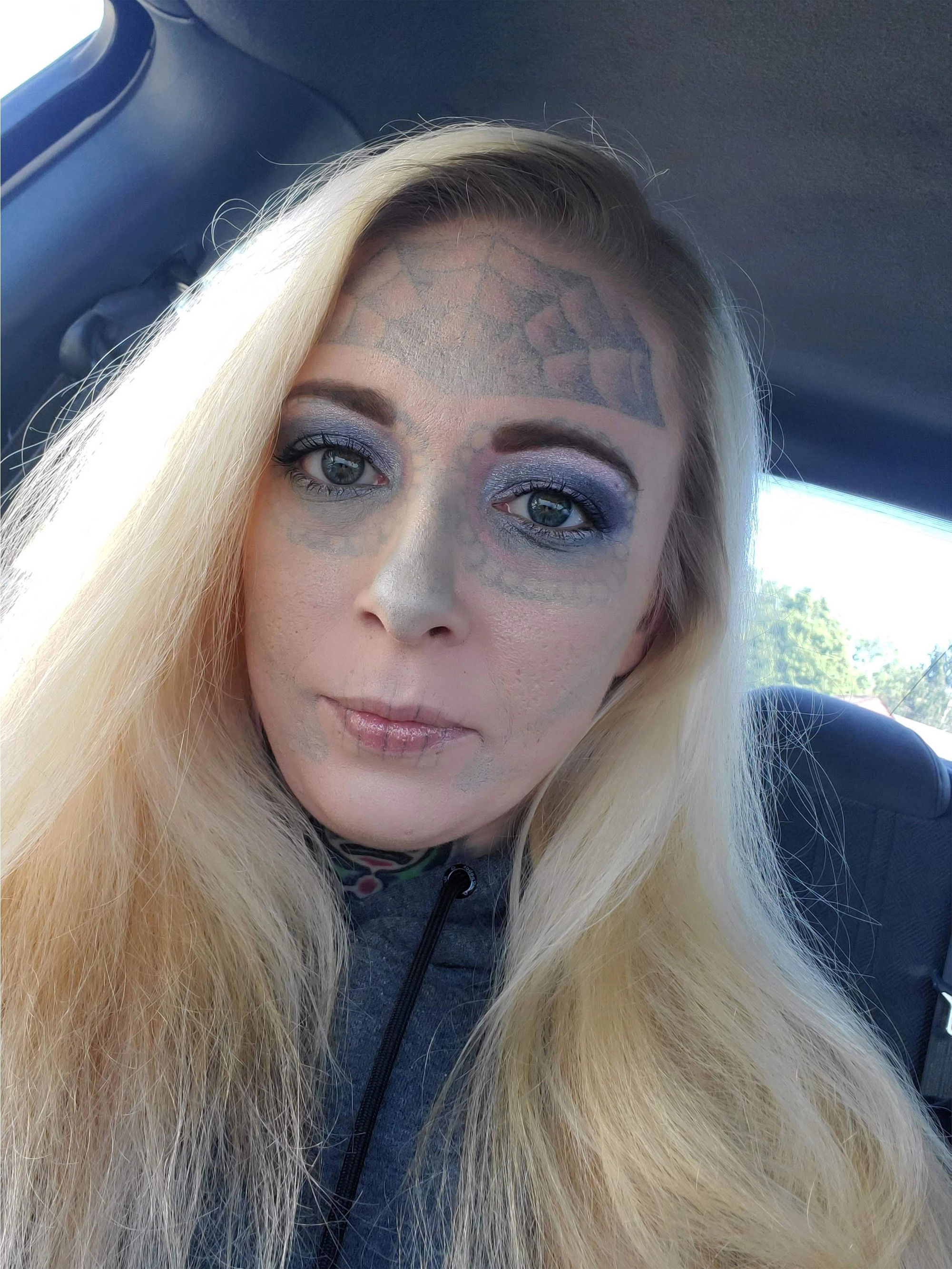 Hendes forbryderbillede viste et ansigt, der var dækket af flere store tatoveringer, der var særligt synlige i hendes bane samt omkring hendes øjne.