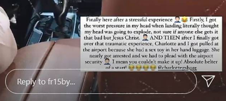 “Charlotte og jeg blev trukket til siden i lufthavnen, fordi hun havde pakket et sexlegetøj i sin håndbagage. Hun blev næsten anholdt, og vi blev nødt til at bønfalde sikkerhedsvagterne i lufthavnen. Det er næsten for sjovt til at finde på! Absolut vild start på turen!”