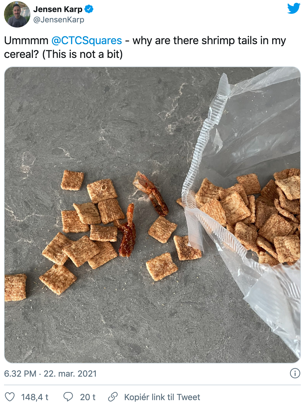 “Hvorfor er der rejehaler i min morgenmad? Det er ikke en joke,” skriver han til billedet, hvor han ligeså bruger muligheden til at tagge producenten bag morgenmadsproduktet.