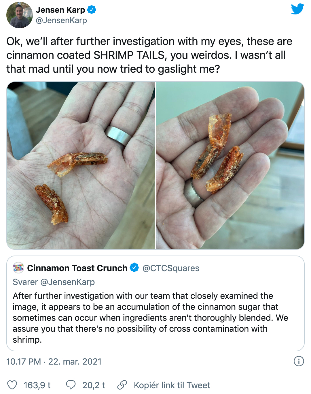 De forsikrer ham om, at der ikke er spor af rejer i deres produktion, og at klumperne, han står med, er ophobning af sukker og kanel, som ikke er blevet blendet godt nok sammen.