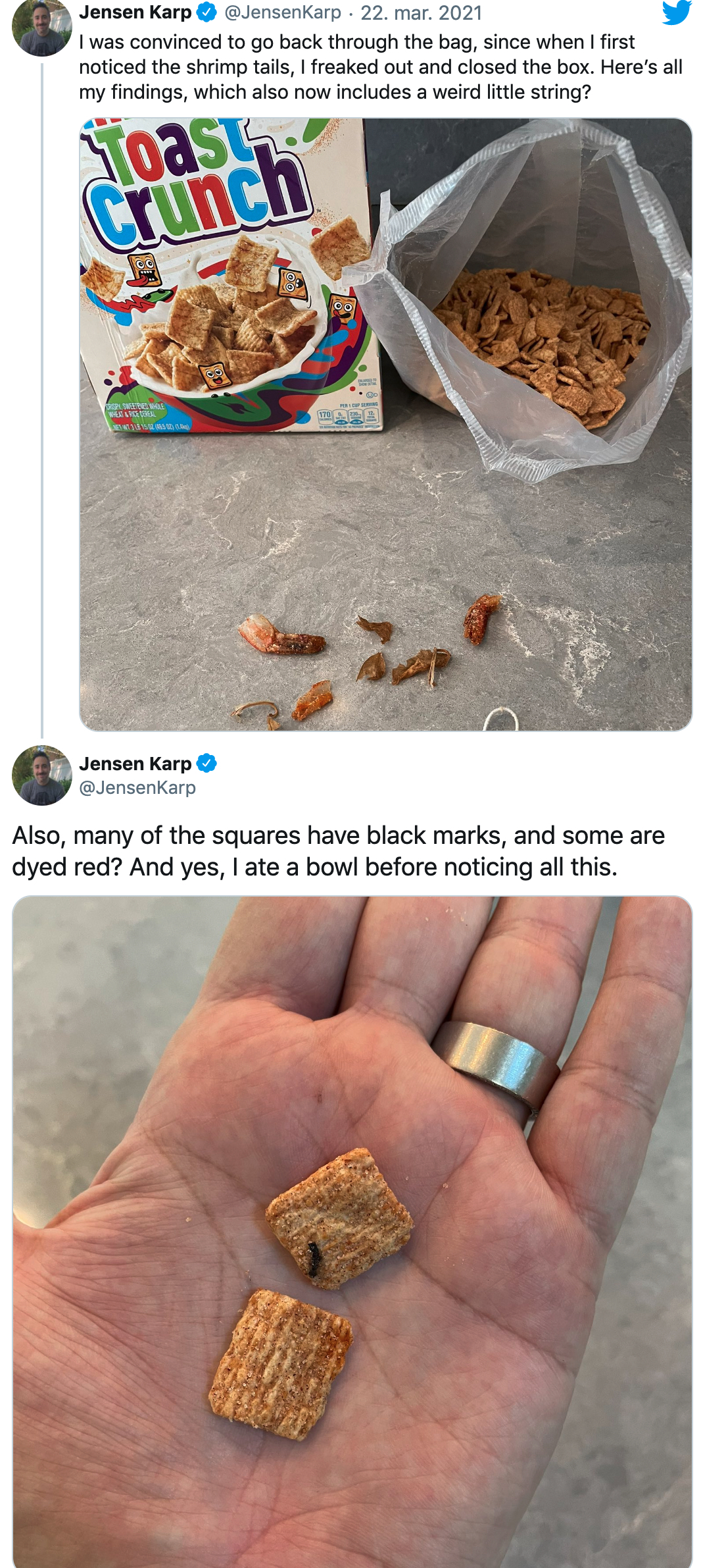 Komikeren Jensen Karp gjorde sig et meget usædvanligt fund, da han i sit morgenmadsprodukt faldt over noget, der lignede rejehaler – men det var kun starten på en række klamme fund.