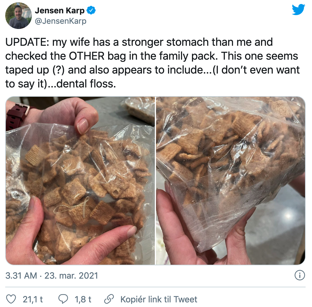 “Det ser ud til (og det her har jeg virkelig ikke lyst til at sige), at der er tandtråd i posen,” skriver han til opslaget på Twiter, hvor man kan se, at posen er blevet tapet til.