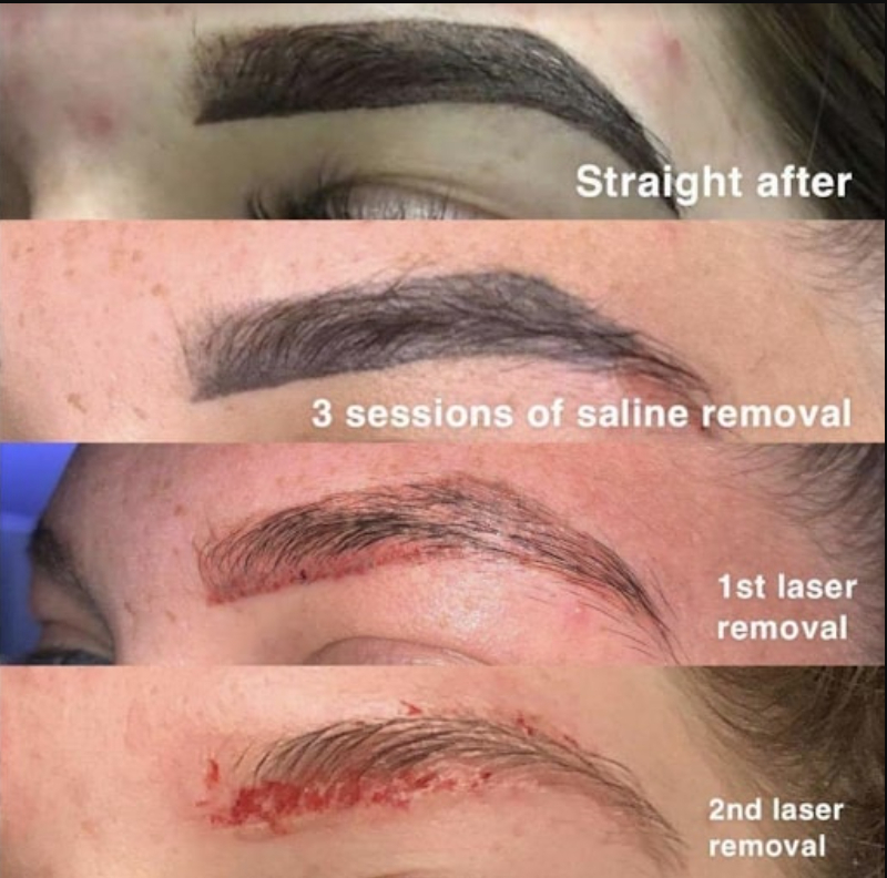 På grund af blækket, der blev aflejret for dybt i hendes hud, smeltede de lasede bryn til én farveblok og fik hende til at “se konstant sur ud”.