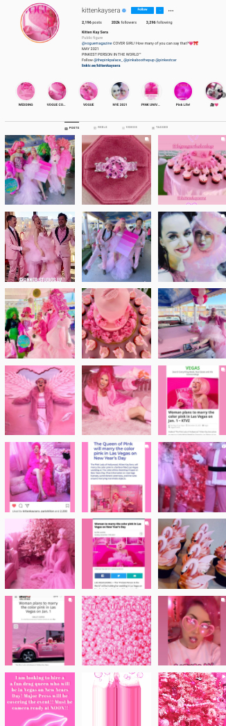 Tjekker man Seras Instagram (@kittenkaysera), så er det da heller ikke svært at se, at hun virkelig elsker sin nye ‘mand’. Man skal nemlig ‘scrolle’ rigtig langt for at finde et billede, som ikke er domineret af pink, og der er faktisk ikke et eneste billede, som ikke indeholder en lille smule pink.