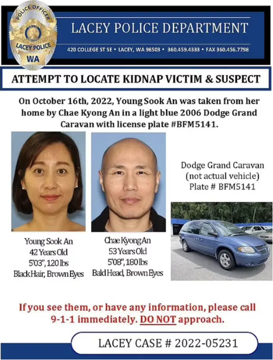 Søndag d.16 oktober, omkring kl 01, blev Young Sook An angiveligt bortført af hendes mand, Chae Kyong An, fra hendes hus i en forstand i Washington, USA.