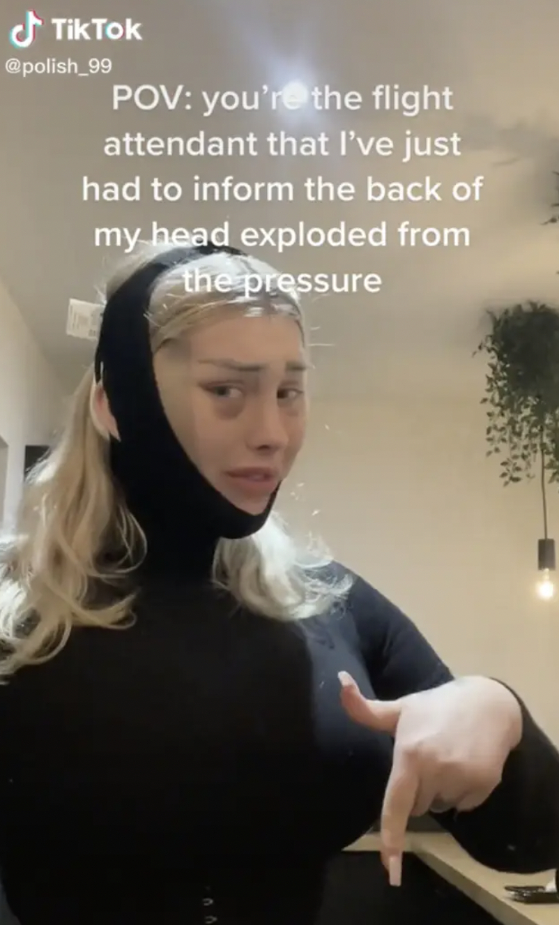 Weronika fortæller nemlig i videoen, at hendes baghoved “eksploderede” under en flyvetur som følge af lufttrykket.