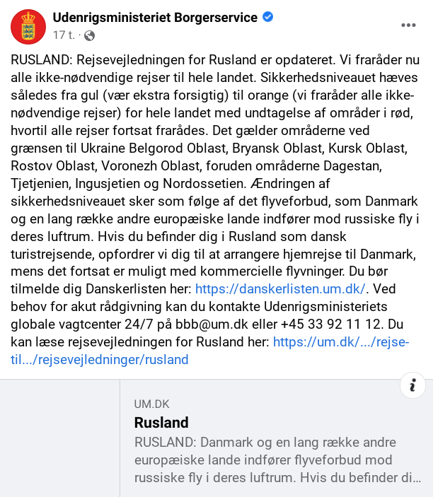 Opslaget fortsætter: “Hvis du befinder dig i Rusland som dansk turistrejsende, opfordrer vi dig til at arrangere hjemrejse til Danmark, mens det fortsat er muligt med kommercielle flyvninger.”