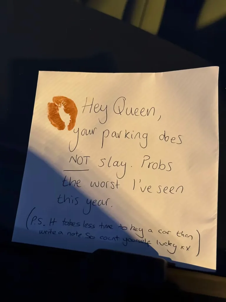 “Hej Queen, din parkering slayer ikke. Sandsynligvis den værste, jeg har set i år. P.S. Det tager kortere tid at ridse en bil end at skrive en seddel, så du kan regne dig selv for heldig,” stod der på sedlen.