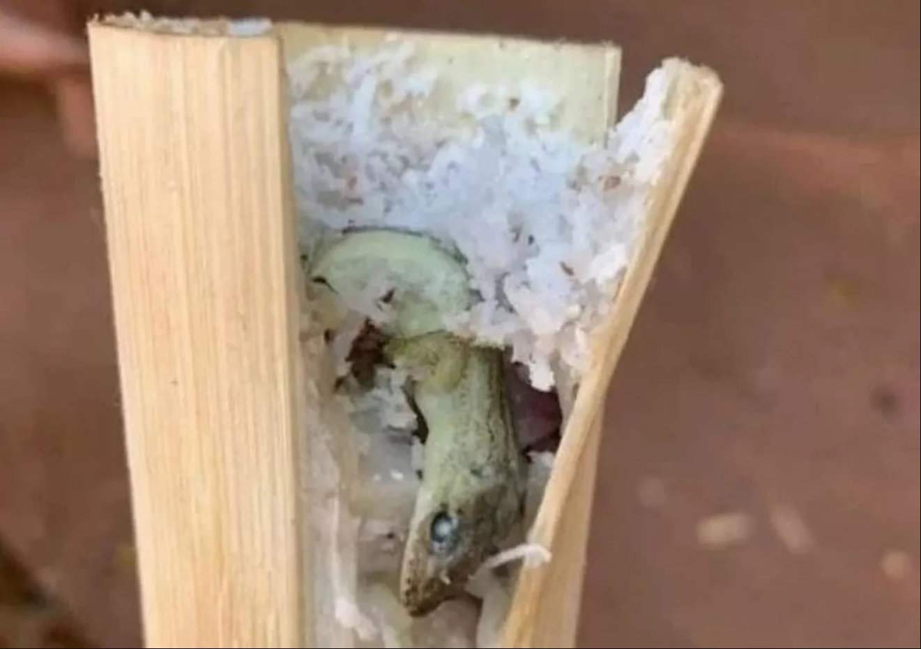 Små øgler er normalt ikke inkluderet, derfor blev Lisa chokeret, da hun åbnede bambuset og fandt en gekko. Billedet, hun delte, viser den døde gekko, der stikker ud fra midten af risen.